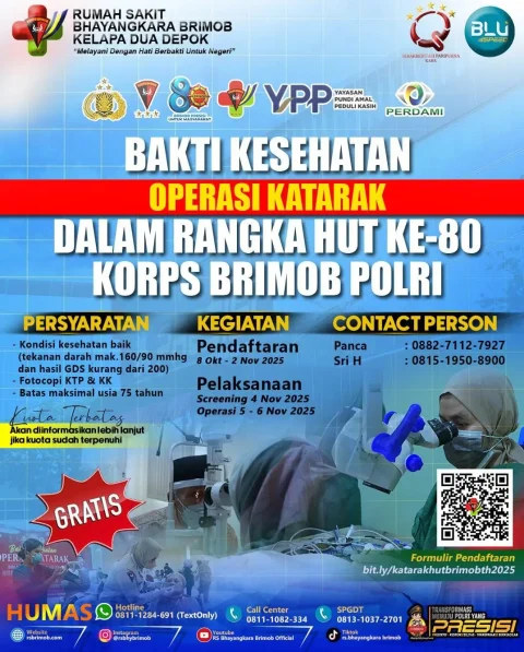 Bagi warga yang ingin mendaftar, dapat menghubungi narahubung Panca di nomor 0882-7112-7927 atau Sri di nomor 0815-1950-8900. Pendaftaran juga bisa dilakukan secara daring melalui tautan bit.ly/katarakbrimobth2025.