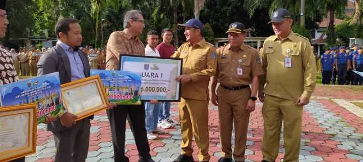 Penyerahan hadiah kepada para pemenang dilakukan langsung Wakil Wali Kota (Wawalkot) Depok Chandra Rahmansyah, saat apel pagi di Lapangan Apel Balai Kota Depok, Senin (15/12/2025).